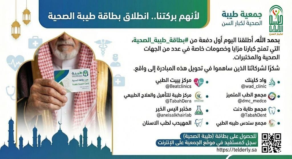 خطوة جديدة لخدمة كبار السن.. 💳 تم إصدار الدفعة الأولى من (بطاقة طيبة الصحية) بالتعاون مع عدد من الجهات الصحية (مستشفيات، مراكز...